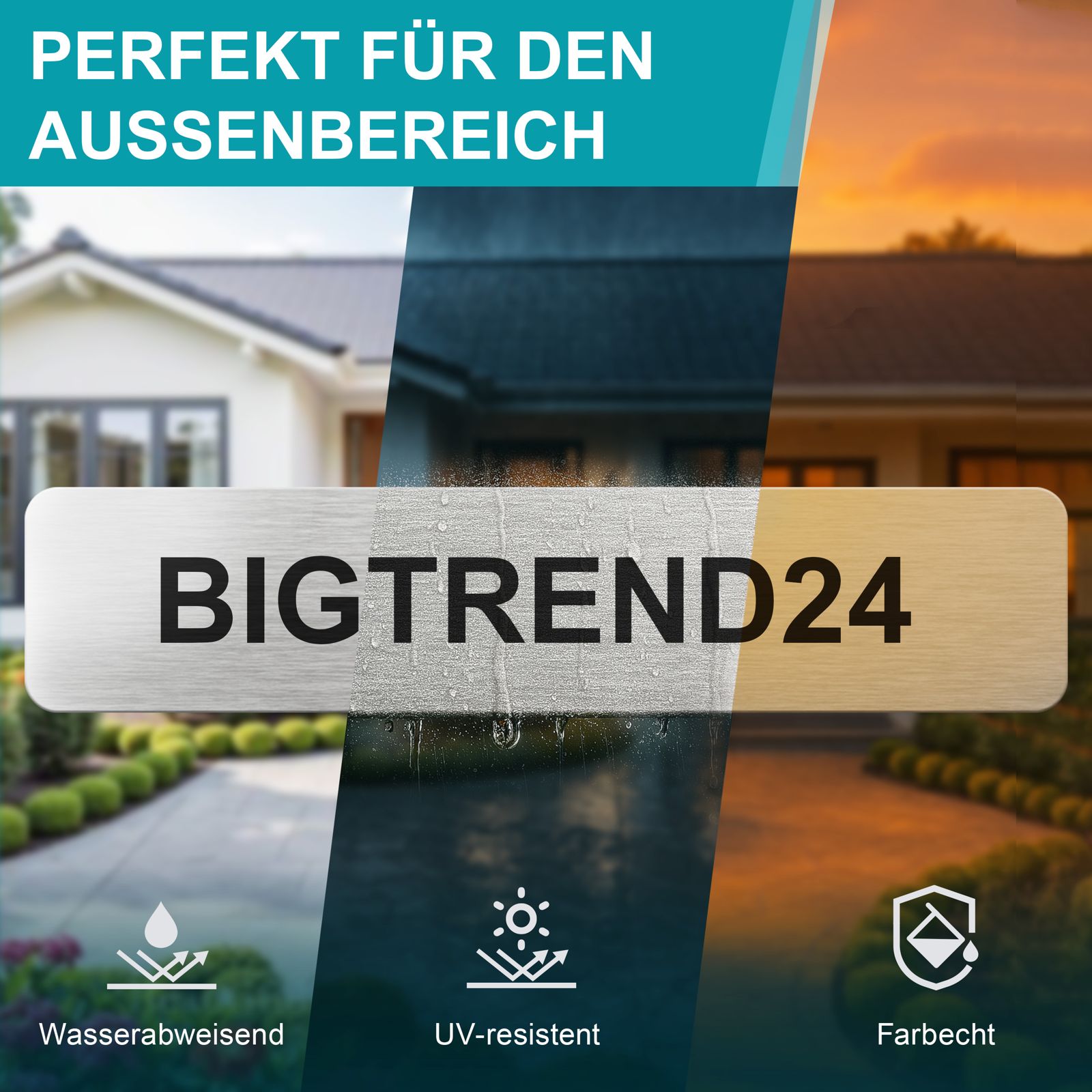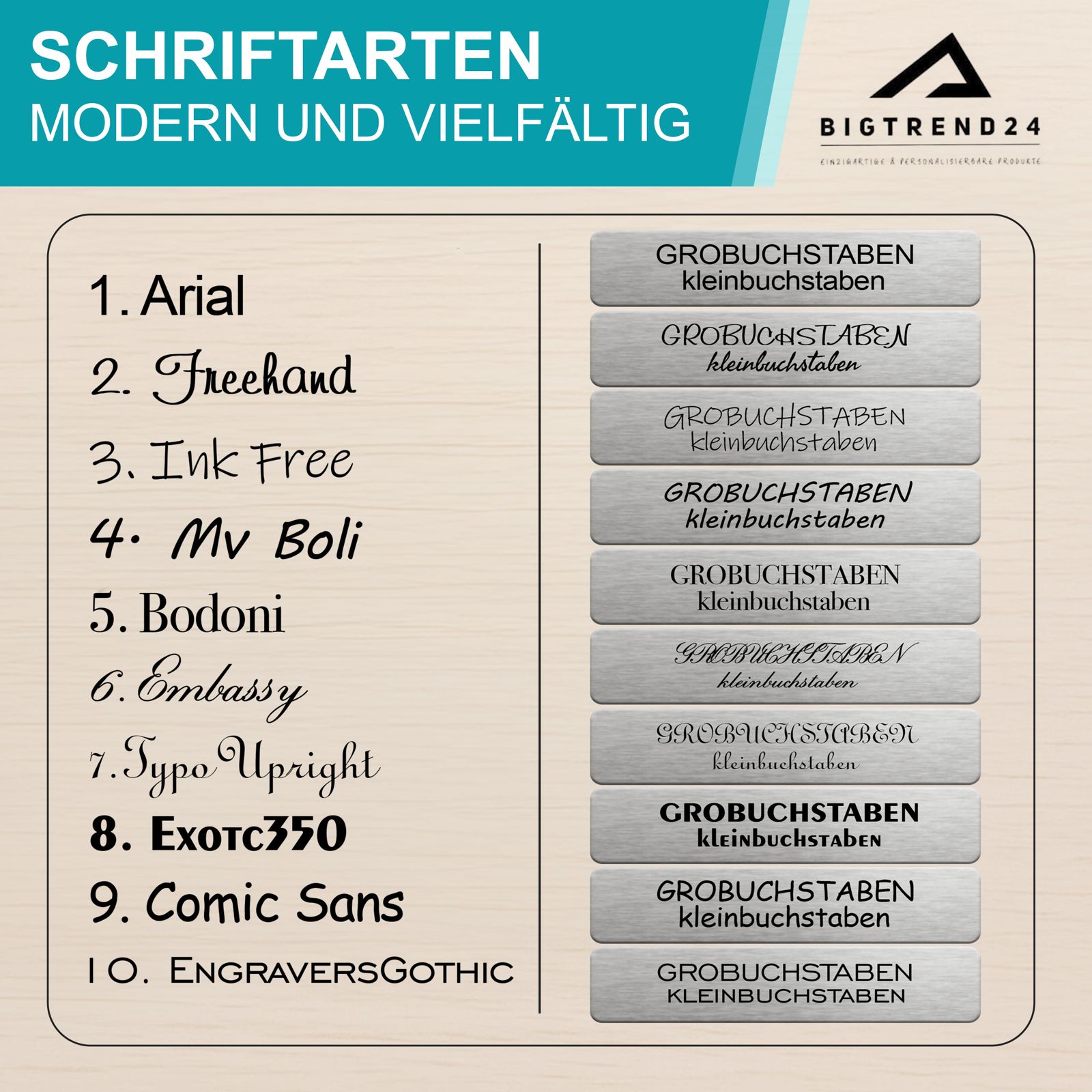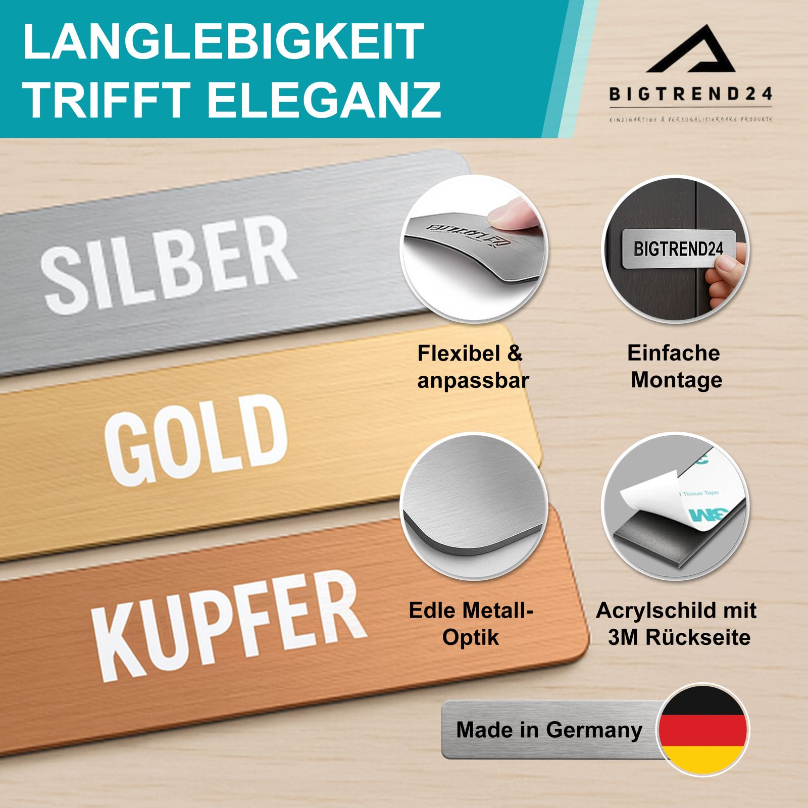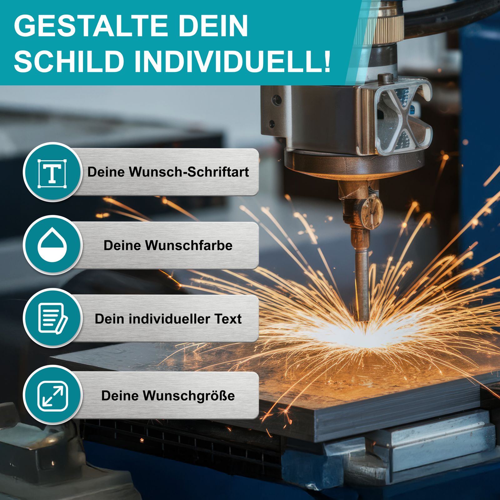 Einzelheiten: Graviertes Kunststoffschild in verschiedenen Farben und Größen. SELBSTKLEBEND: Auf der Rückseite befindet sich hochwertiges Selbstklebeband der Marke 3M für optimale und lange Haftkraft WITTERUNGSBESTÄNDIG: Das Schild kann sowohl im Innenraum als auch draußen angebracht werden. Wind und Wetter beeinflussen das Aussehen nicht.