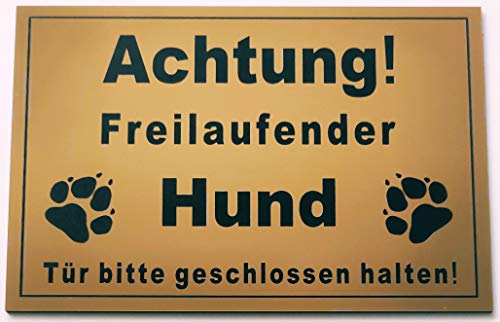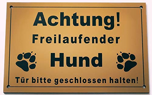 Warnschild Achtung Freilaufender Hund, Tür geschlossen halten, Schild Hundeschild Gold